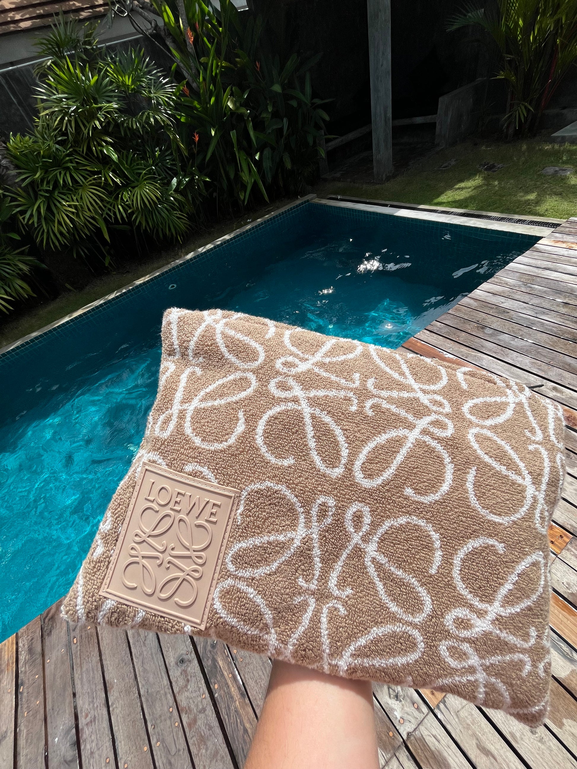 Curated from carefully selected luxury Loewe towels (made of 100% woven cotton) with the signature Loewe printed all over. Perfect to keep all your personal items together while on the go, whether hitting the beach, at the gym or in your baby bag this pouch is the perfect solution for your bag organisation!
