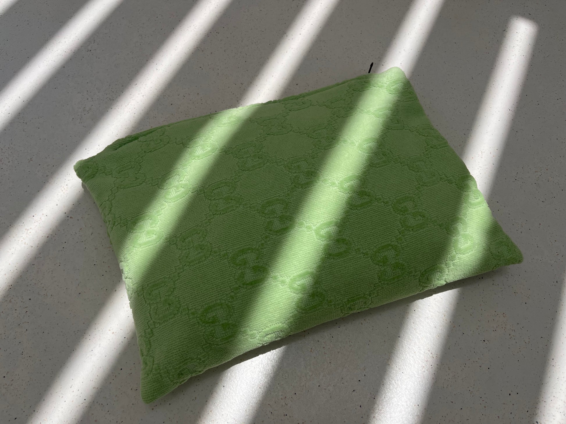 Curated from carefully selected luxury Gucci towels (made of 100% woven cotton) in a gorgeous green colour with their signature anagram print. Perfect to keep all your personal items together while on the go, whether hitting the beach, at the gym or in your baby bag this pouch is the perfect solution for your bag organisation!